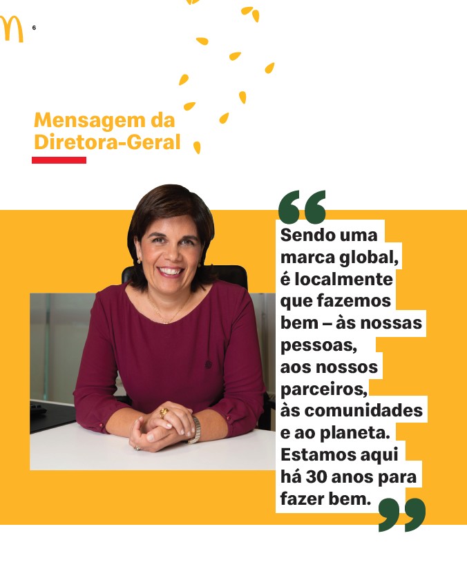 6 Mensagem da Diretora-Geral “ Sendo uma marca global, é localmente que fazemos bem – às nossas pessoas, aos nossos parceiros, às comunidades e ao planeta. Estamos aqui há 30 anos para fazer bem. ”