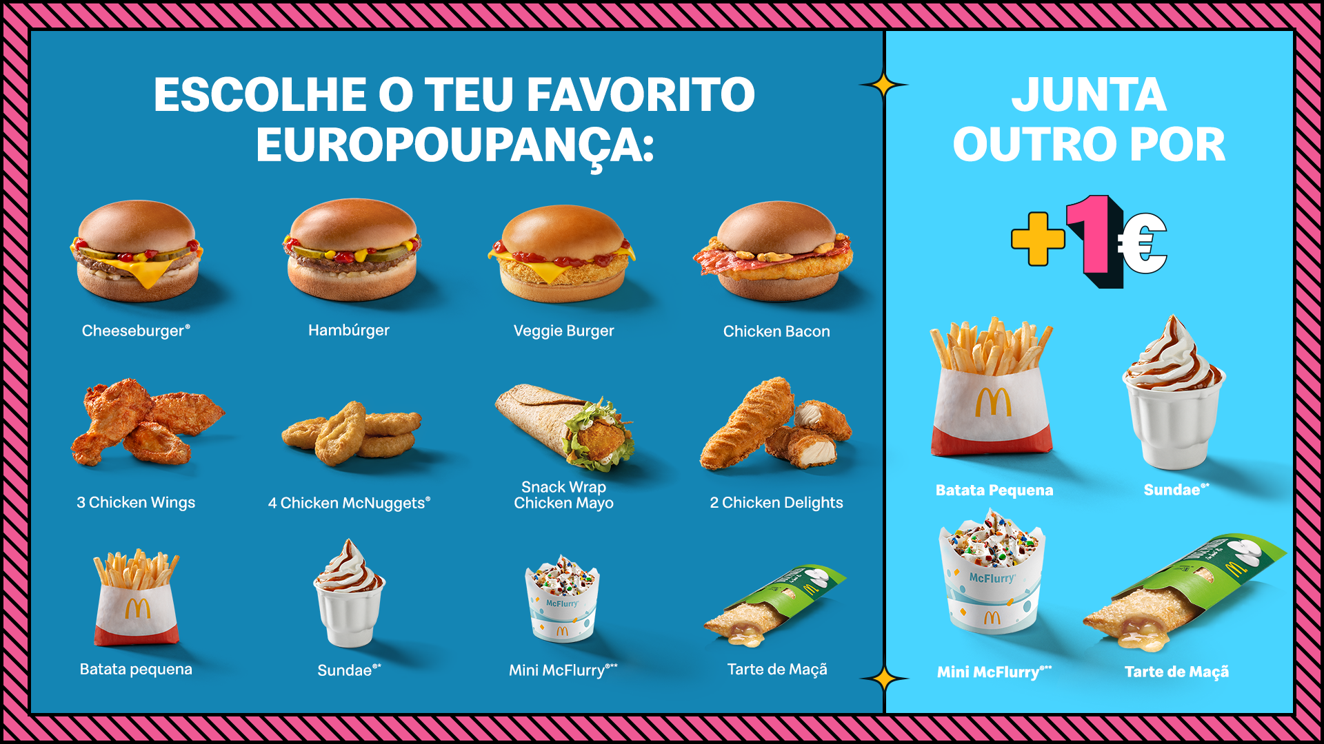 ©2025 McDonald's. Imagens ilustrativas. Válido na compra de um item selecionado na primeira escolha que pode ser: Cheeseburger®, Hambúrguer, Veggie Burger, Chicken Bacon, 3 Chicken Wings, Snack Wrap Chicken Mayo, Snack Wrap Chicken Cheese, 4 McNuggets®, 2 Chicken Delights, Batata Pequena, Sundae®, Mini McFlurry®, Tarte de Maçã e na selecção na segunda escolha de: Batata Pequena ou Tarte de Maçã ou Sundae®* ou Mini McFlurry®**. Limitado ao stock existente. *Sundae aplicável: Morango, Chocolate, Natura, Caramelo / **Mini McFlurry® aplicável: M&Ms®, Oreo®, KitKat®.